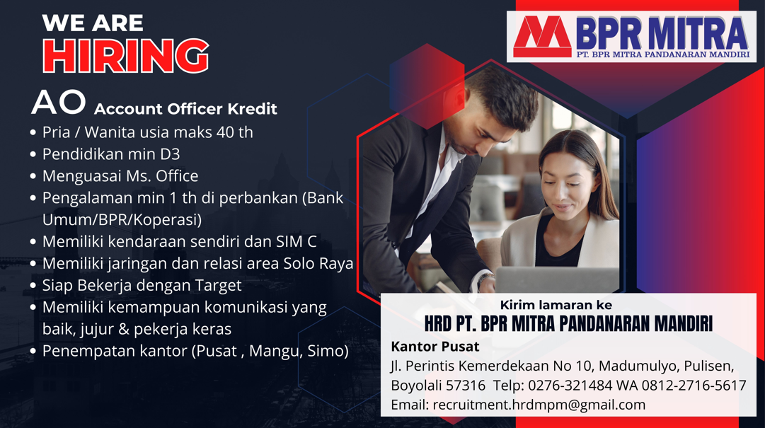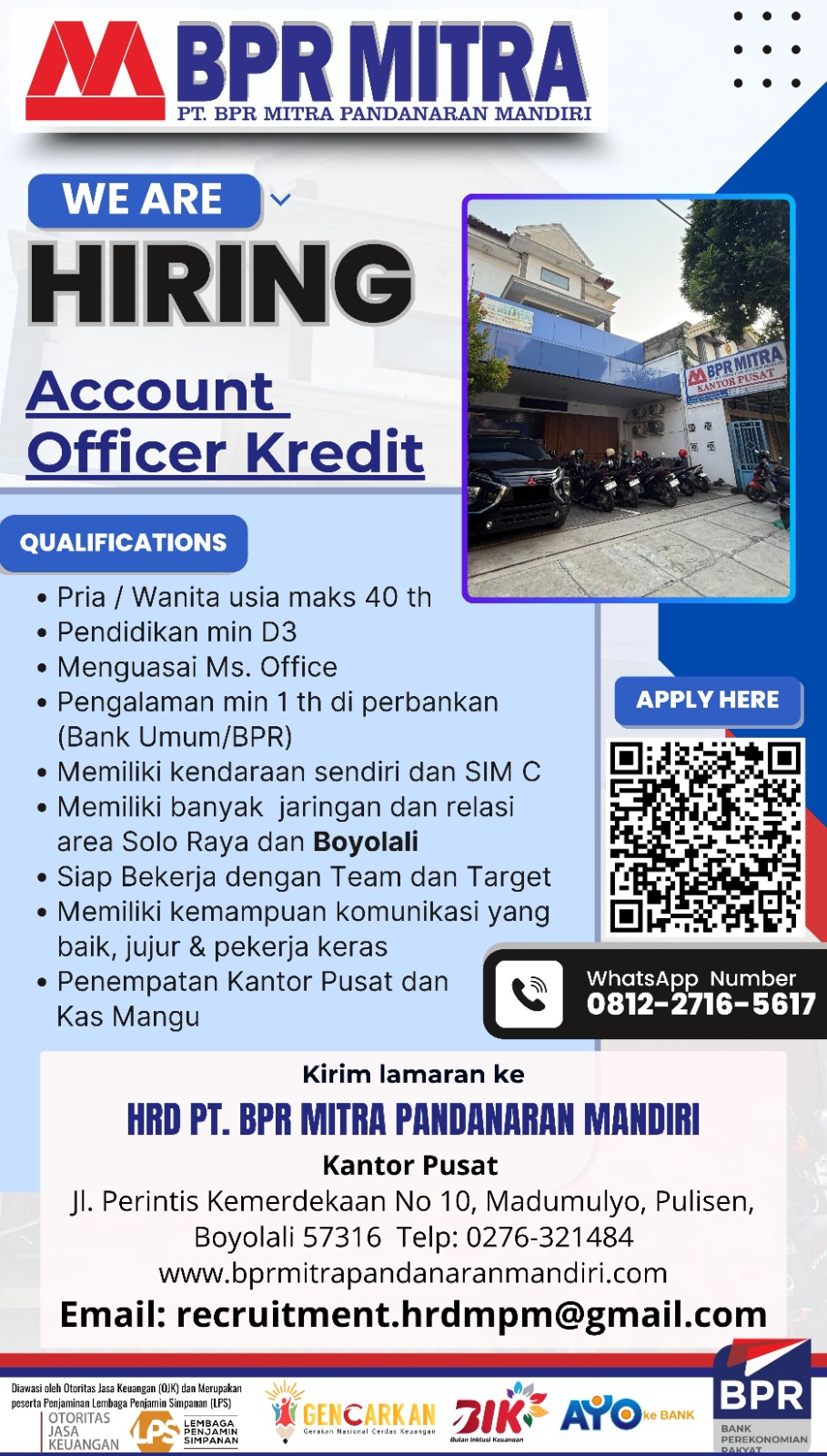 PT. BPR Mitra Pandanaran Mandiri Kami mencari individu yang berkompeten, berdedikasi, dan siap berkembang bersama Perusahaan. Jika Anda memiliki kemampuan dan semangat untuk berkontribusi dalam dunia perbankan, segera bergabung bersama tim kami. Kirimkan lamaran Anda sekarang dan raih kesempatan untuk berkembang bersama kami! Jadilah bagian dari keluarga besar PT. BPR Mitra Pandanaran Mandiri!